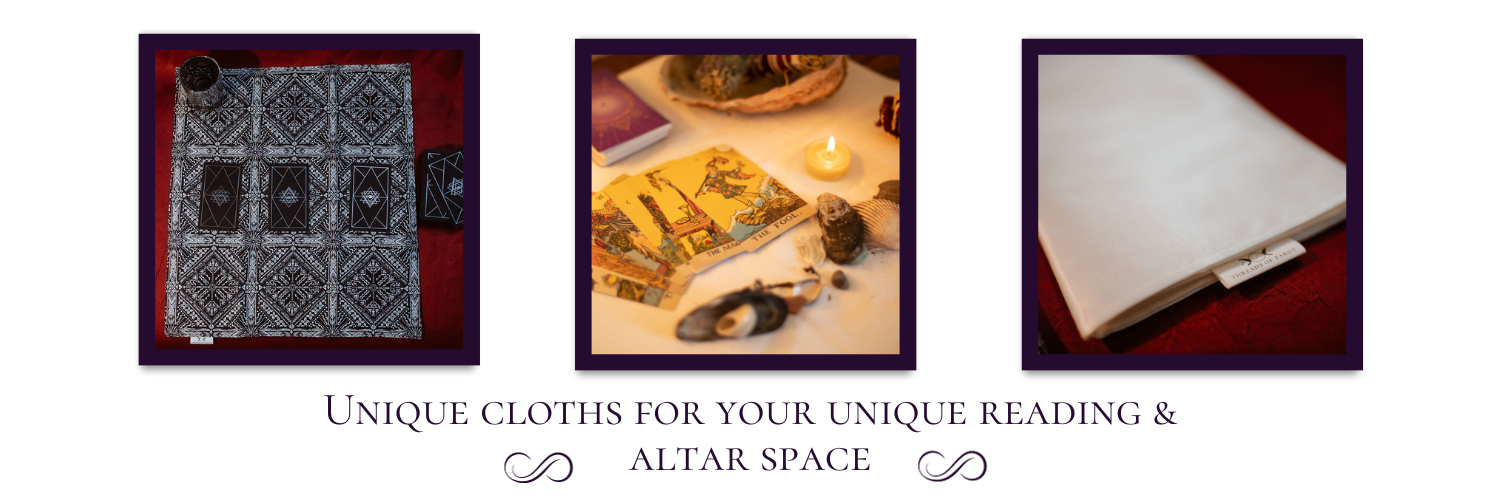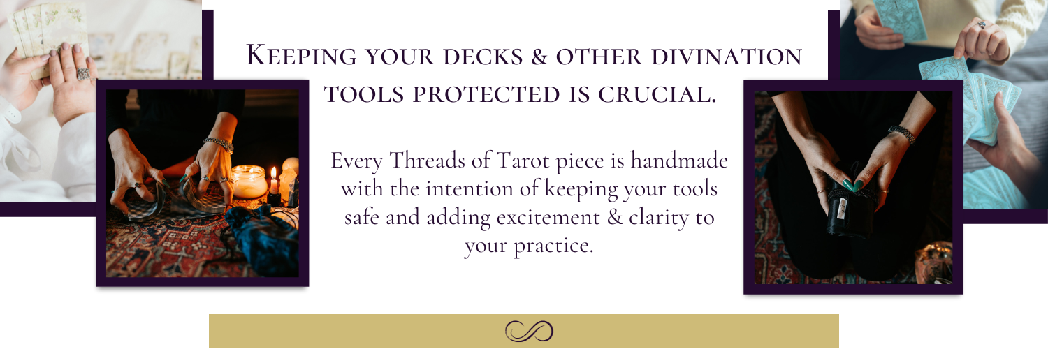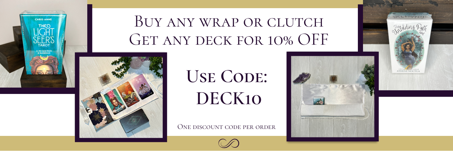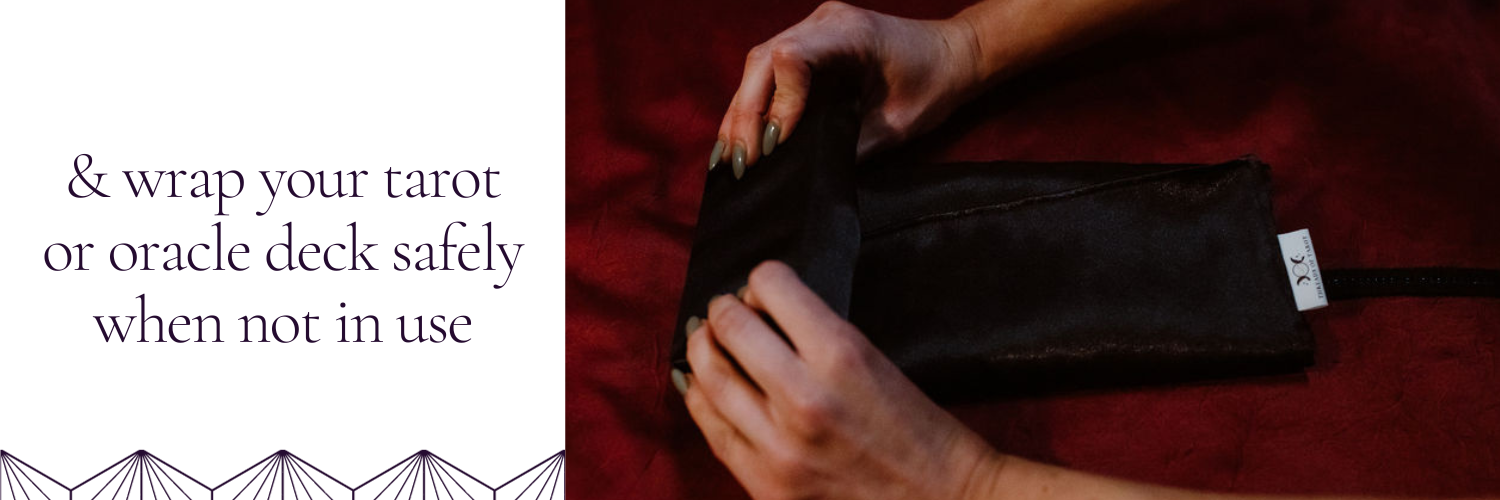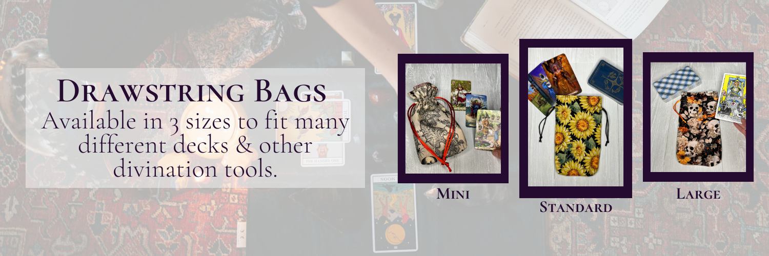 Tarot deck wraps, clutches, bags, reading/altar cloths, and decks.