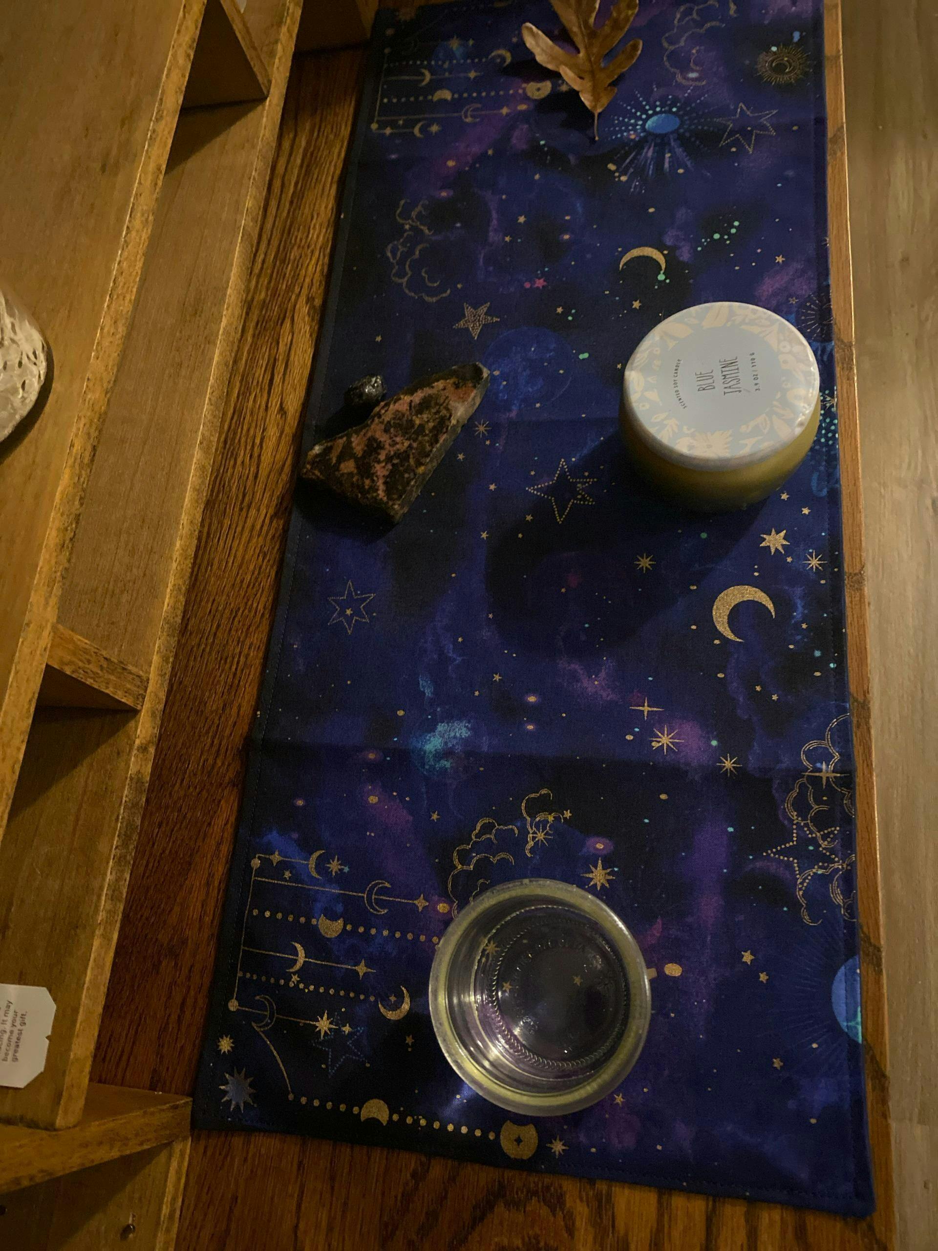 Introducing an enchanting celestial, altar cloth, designed to add a touch of celestial allure to your sacred space. Whether you're seeking to enhance your sacred space, meditation practice or add a touch a galactic energy to your tarot readings, this stunning altar cloth is the perfect addition to your spiritual journey. This tarot/altar cloth is handmade by me with the very intention of keeping your sacred space and tools safe. <3