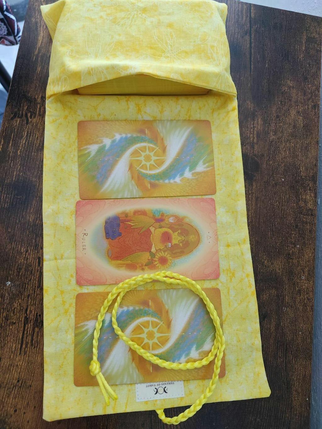 Perfect for your more cheerful and bright decks, this tarot wrap pouch is handmade by me with the very intention of keeping your deck safe. The outside fabric is a yellow fabric adorned with dragonflies, a symbol of self-realization and transformation, much like the tarot. The inside lining is a patterned, yellow fabric to pair with the outer fabric.. Just tuck your deck inside the pouch, wrap the flap around the deck and secure it with the yellow, braided, satin cord – easy peasy. The flap was designed to be long to allow space to sling some cards on-the-go.